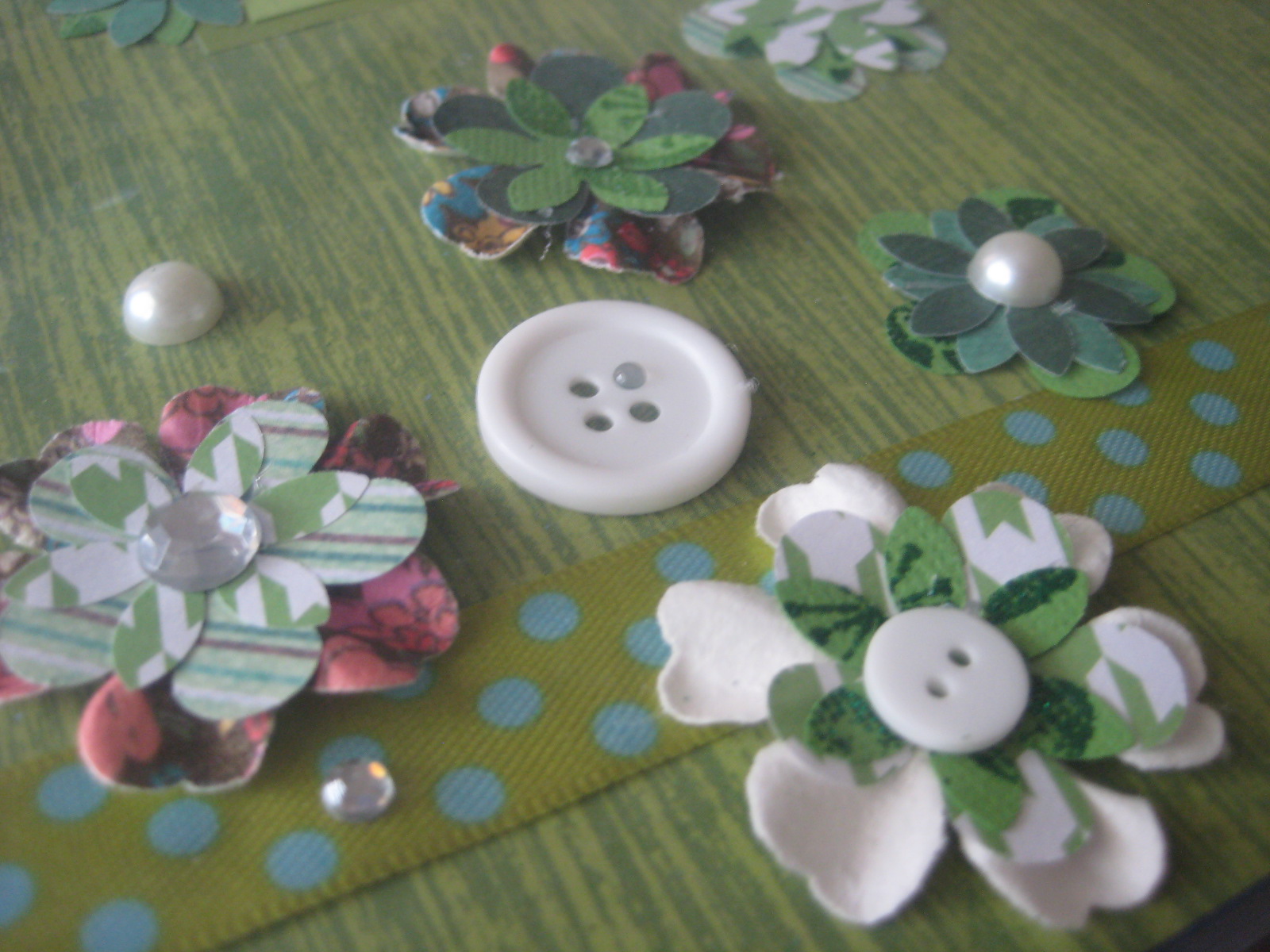 Buttons + pearls + rhinestones + ribbons + patterned cardstock